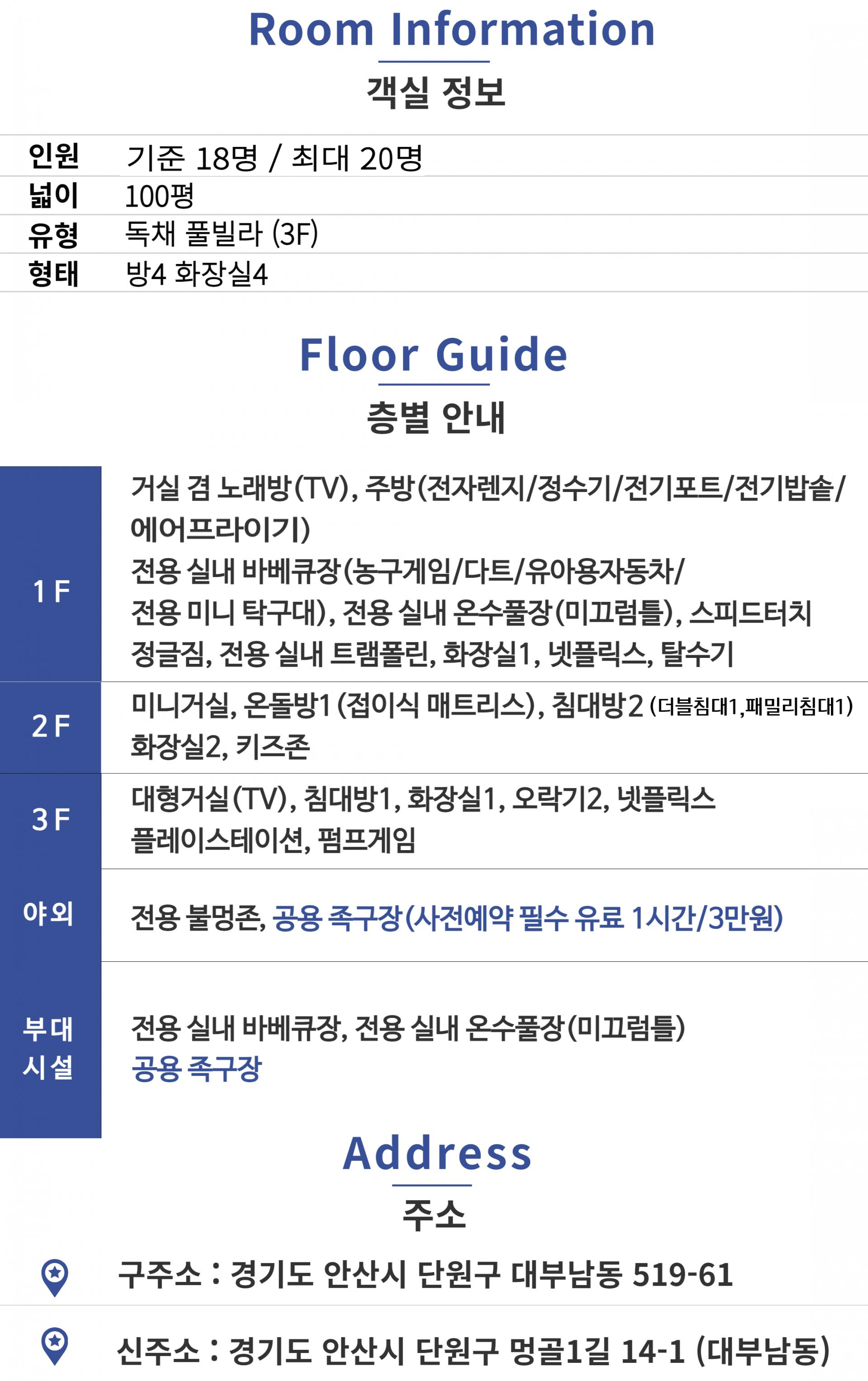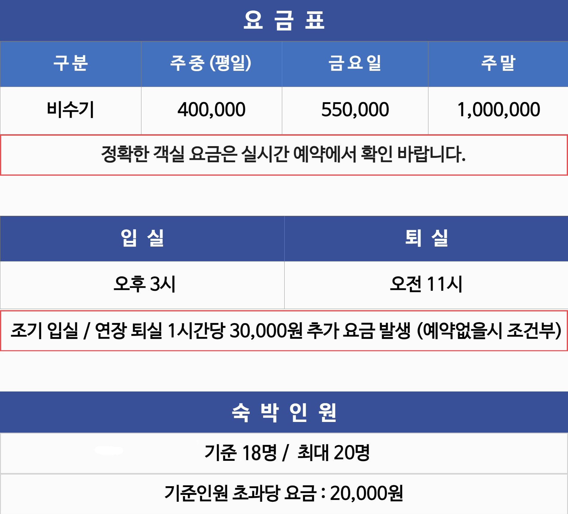 워크샵, 가족, 커플여행 등 다양한 컨셉의 펜션예약이 가능하며 펜션 내 개별 풀장, 전용 바비큐장, 노래방, 전용족구장, 스포츠 게임 등 다양하고 프라이빗한 여행을 즐기실 수 있습니다.