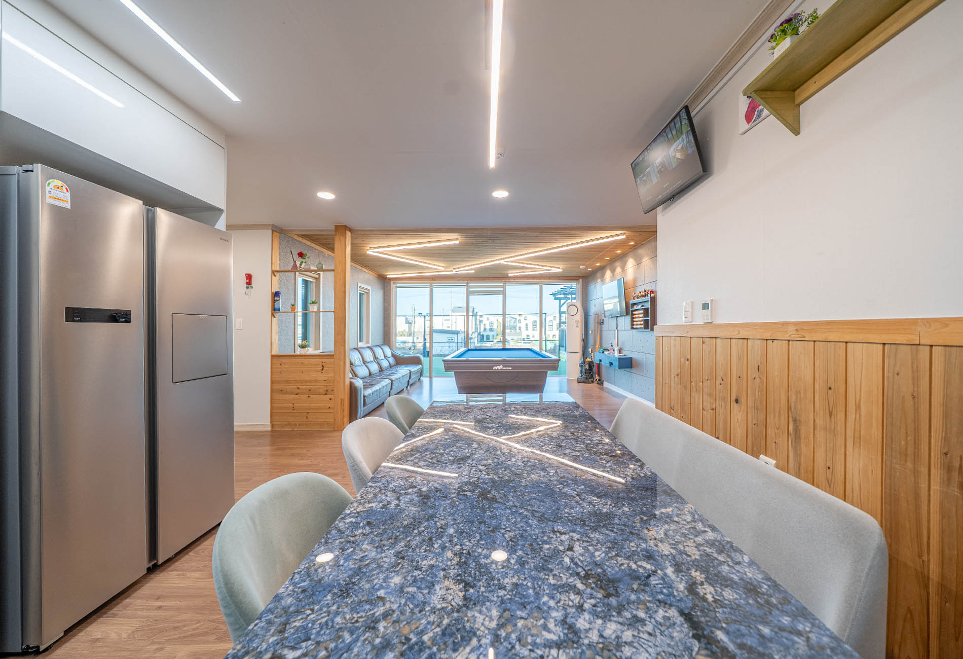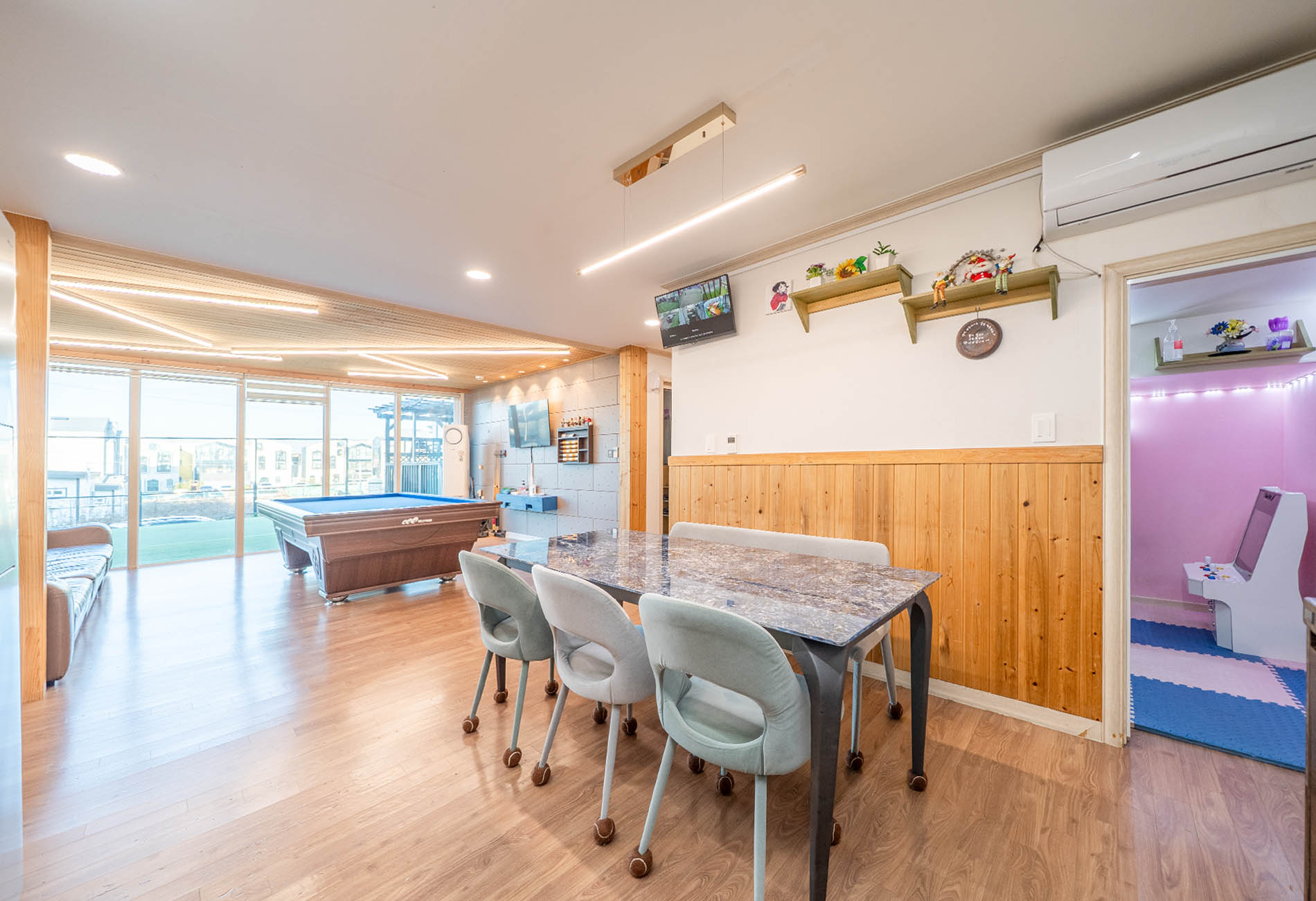 거실 노래방, 당구대, 노래방 겸 온돌방1,키즈룸,온돌방1(오락기1),화장실2,실내온수풀장,실내바베큐장